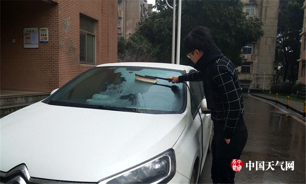 1月25日,湖北武汉遭遇冻雨天气,腊梅变成了“冰梅”,叶片上、花朵上、车上都结上了一层水滴形的冰。(摄/李梦蓉)