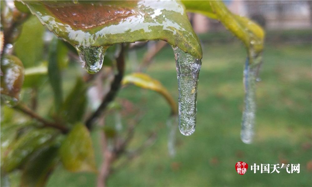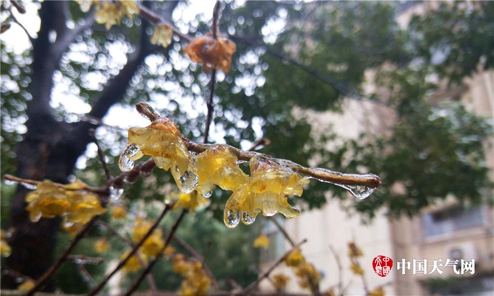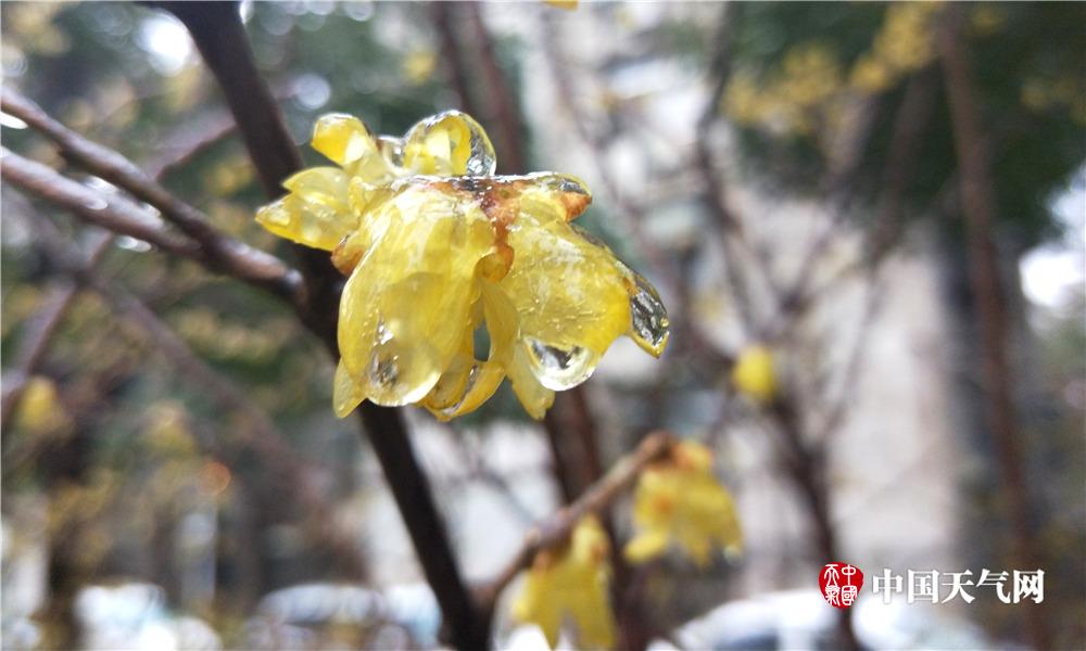 1月25日,湖北武汉遭遇冻雨天气,腊梅变成了“冰梅”,叶片上、花朵上、车上都结上了一层水滴形的冰。(摄/韩琦)