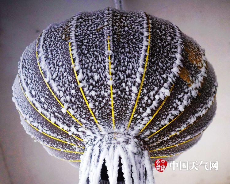 高山上挂着的灯笼被冰雪覆盖。 (文/图 陈碧生)