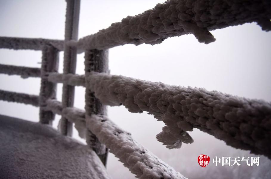 栏杆上结起厚厚的冰。 (文/图 陈碧生)