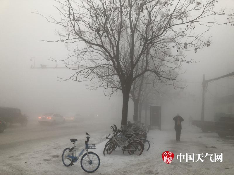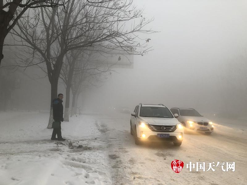 1月29日,暴雪过后的湖北省迎来今年最低温,各地出现了严重的道路结冰现象。图为襄阳市大雾加上路面结冰,汽车艰难行进。(拍摄:尤雪)