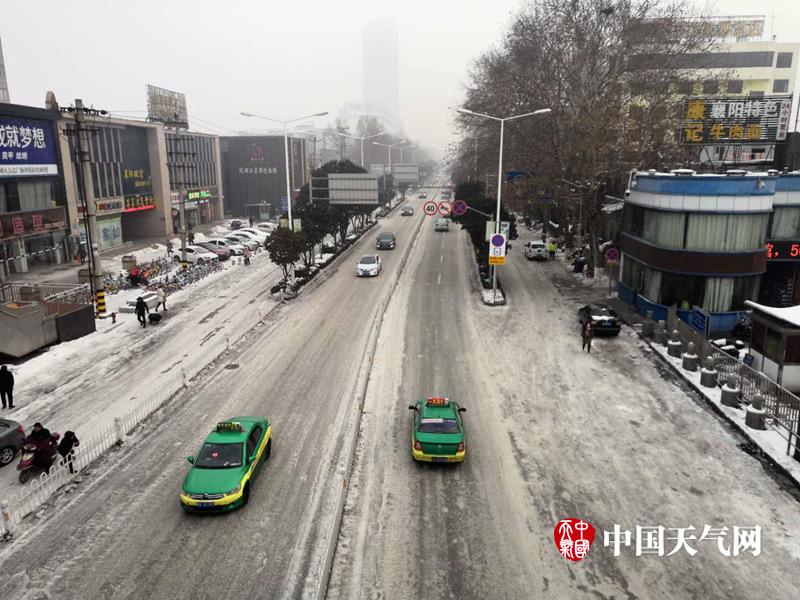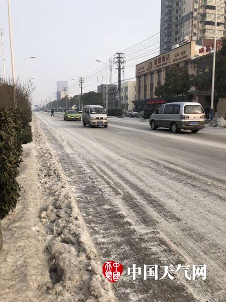 1月29日,暴雪过后的湖北省迎来今年最低温,各地出现了严重的道路结冰现象。图为襄阳市路面结冰,汽车艰难行进。(拍摄:尤雪)