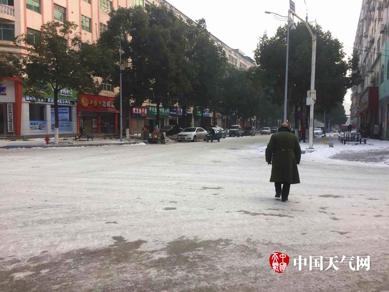 1月29日,暴雪过后的湖北省迎来今年最低温,各地出现了严重的道路结冰现象。图为荆门市路面被厚厚的冰层覆盖,人们溜冰出行。(拍摄:迷糊小姐)