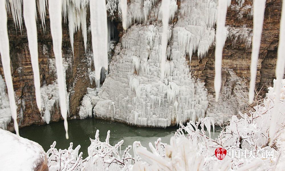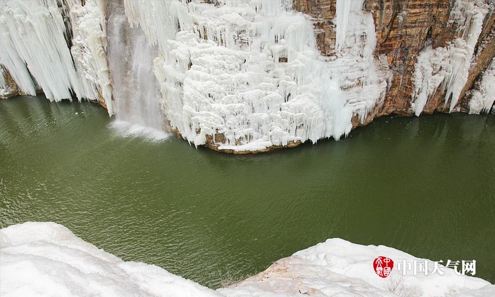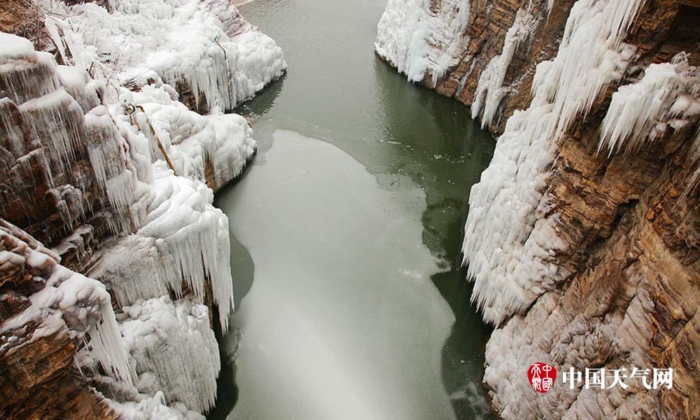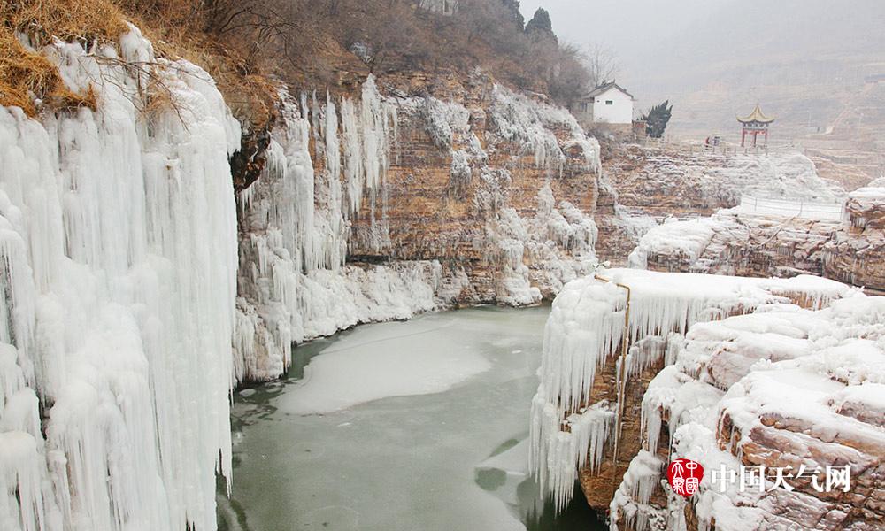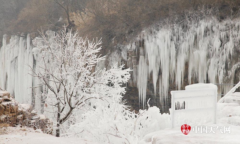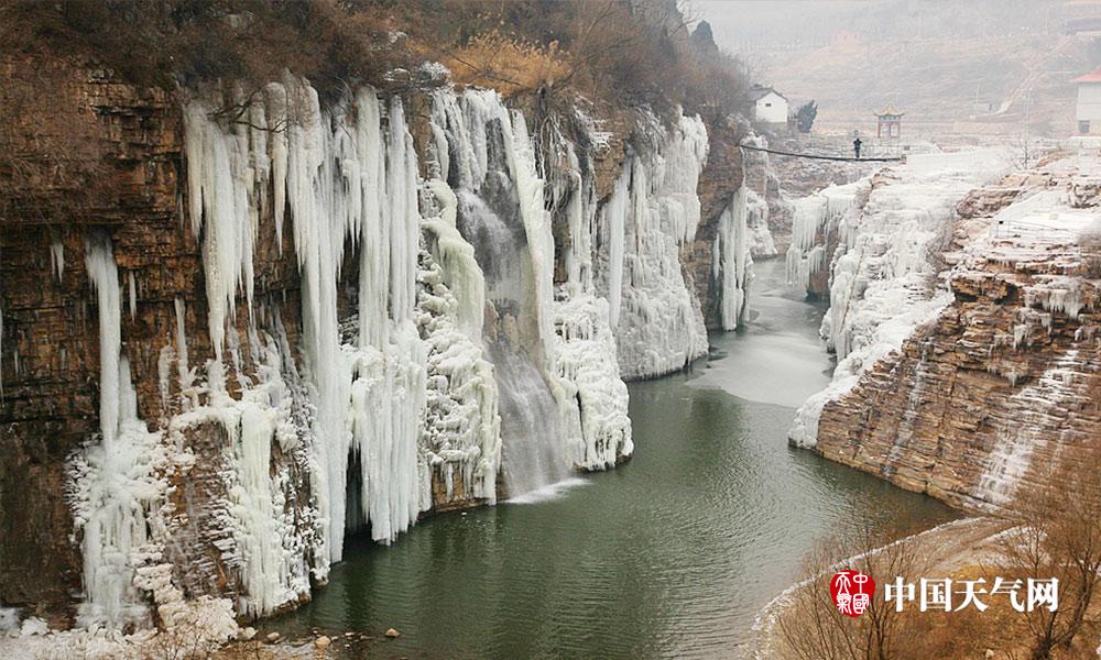 近日河北连续低温天气,白天最高气温也都在零下。河北漳河的瀑布出现结冰现象,形成壮观的天然冰瀑。冰瀑与山体紧密结合在一起,犹如为山体披上了件白衣,冰瀑像雪白的岩石一般坚韧挺拔。人们不禁感叹大自然真是个伟大的雕刻大师。 (摄影/周立新)
