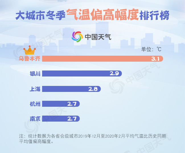 从省会级大城市来看,乌鲁木齐、银川、上海、杭州、南京、南昌、福州、广州等地气温偏高尤为明显,其中乌鲁木齐这个冬季的平均气温为-7.2℃,较历史同期值偏高3.1℃,为偏暖幅度最大的省会级城市;银川冬季平均气温-2.2℃,以偏暖2.9℃成为偏暖榜上第二位。