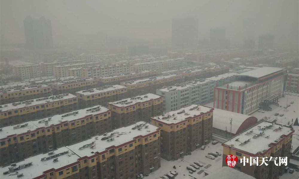2月26日上午,通辽市出现降雪天气,市区上空雪雾蒙蒙。(白秀芳 摄)