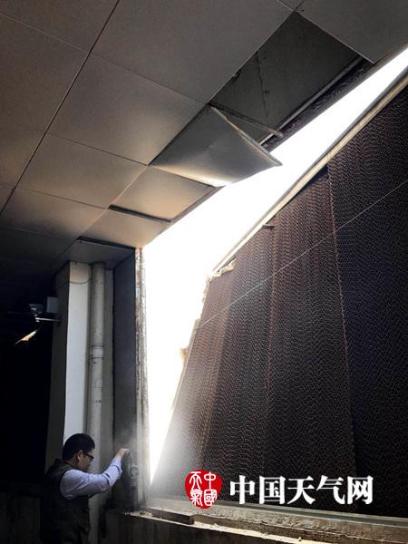 今天(4日)早上7时,忻城遭遇短时雷雨大风,阵风达8~9级,最大风速出现在思练镇为21米/秒,部分树木被刮倒刮断,广告牌、太阳能热水器、瓦片等被吹落,工厂厂房被吹翻所幸没有造成人员伤亡。图为江信太阳能热水器被吹落(摄影:肖彤彤)