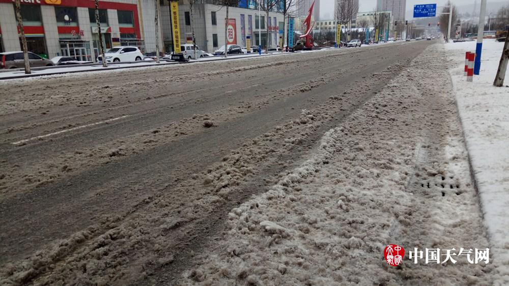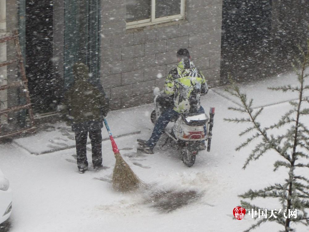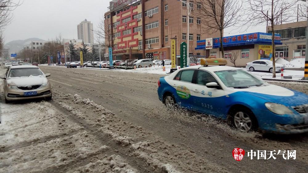 4日白天,烟台部分地区经历先降雨后冰雹,再降雪天气过程。突如其来的降雪,致使道路积雪较多,对市民出行造成一定影响。截至下午14时,烟台市区的风雪仍在继续。预计夜间降水逐渐结束。(孙宗顺/摄)
