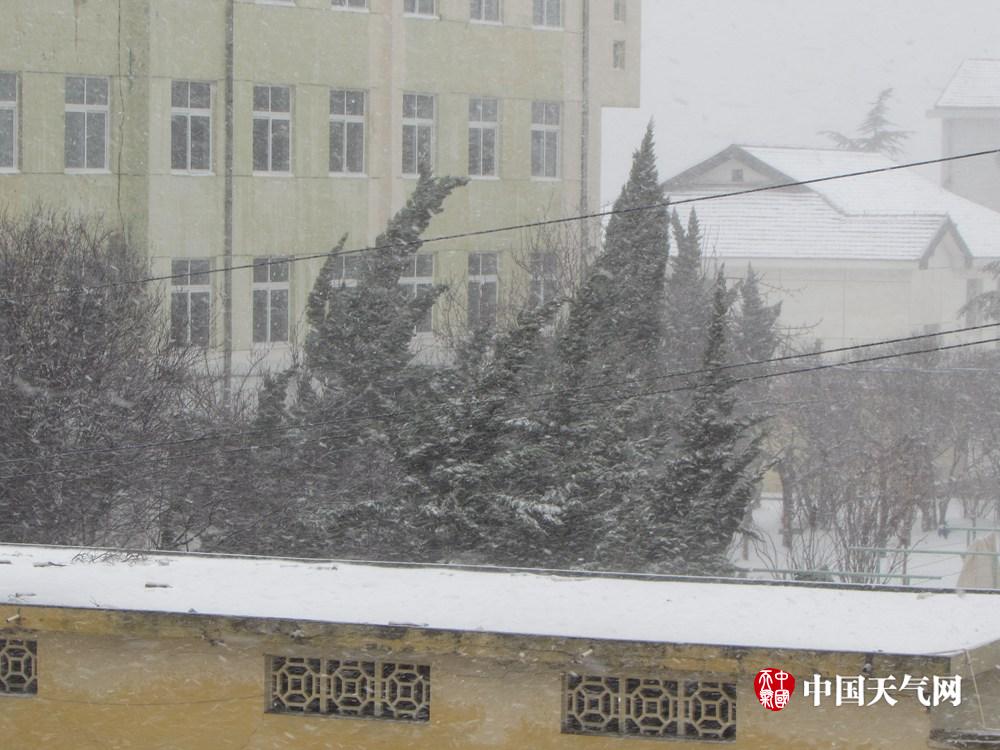 3月4日上午,烟台市区下起小雨,尽管风有些大,但略有春雨的气息。中午时分,天气突变,局部地区降下了一阵小冰雹,不仅风力增大,而且小雨变成了鹅毛大雪,很快,地面就被重新装扮成了冬天的模样。(黄曰华/摄)