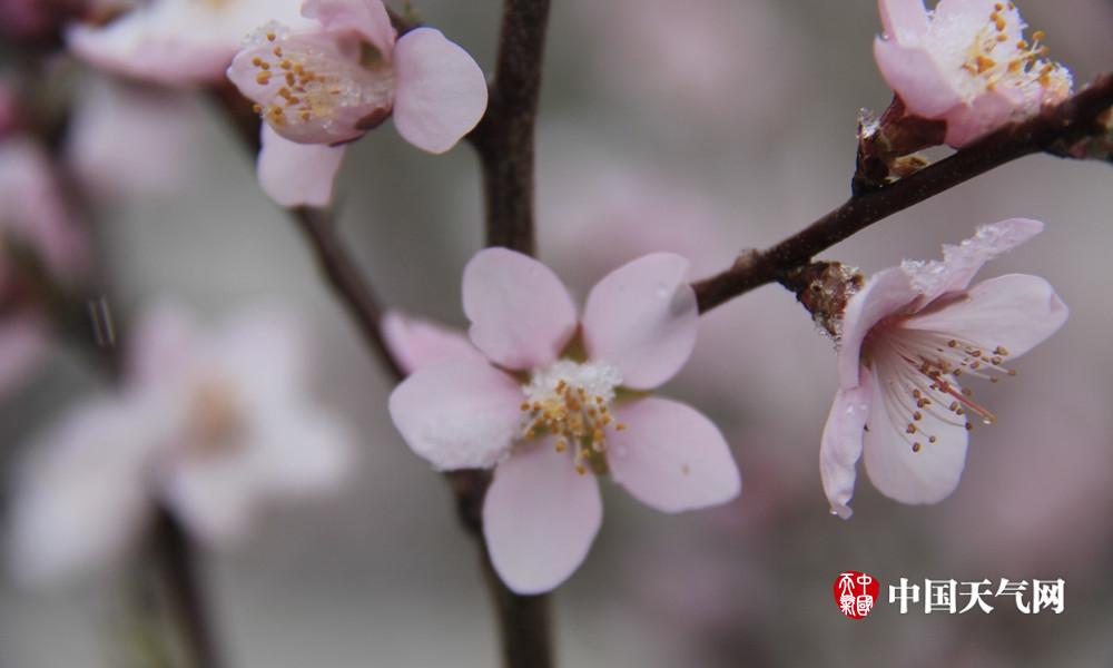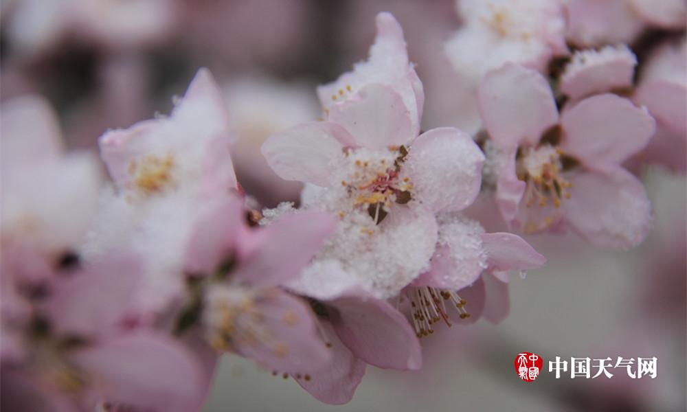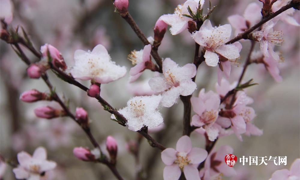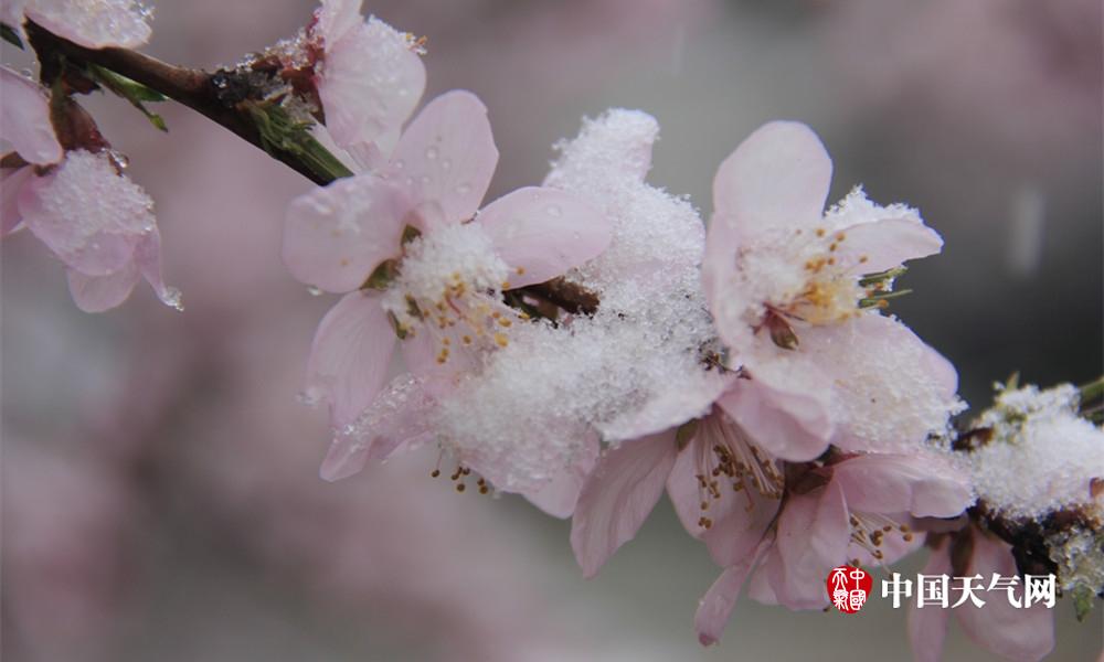 桃花与雪花粉白相映,显得格外妩媚而多情。(余亚庆 摄)