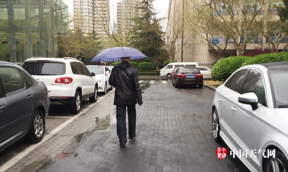 受冷空气影响,今天(3日)中午北京怀柔、密云、延庆等地出现“四月雪”。下午16时,城区出现了明显的降水,气温持续偏低,出行需添衣。图为海淀区白石桥附近,16时左右,行人在冒雨赶路。(摄影:关禺)