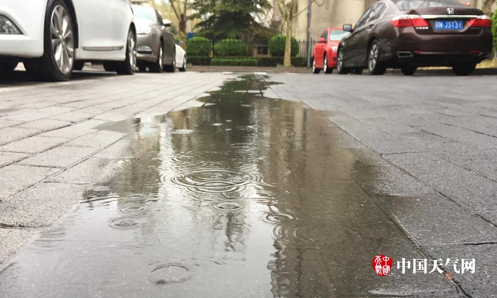 受冷空气影响,今天(3日)中午北京怀柔、密云、延庆等地出现“四月雪”。下午16时,城区出现了明显的降水,气温持续偏低,出行需添衣。图为海淀区白石桥附近,16时左右,路面出现小水洼。(摄影:关禺)