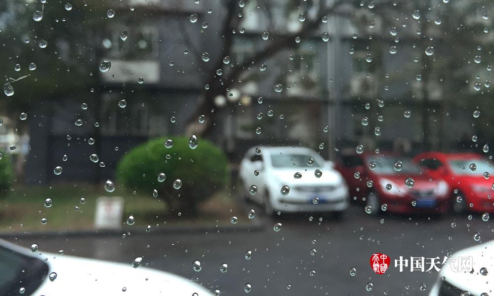 受冷空气影响,今天(3日)中午北京怀柔、密云、延庆等地出现“四月雪”。下午16时,城区出现了明显的降水,气温持续偏低,出行需添衣。图为海淀区白石桥附近,16时左右,窗户上的雨滴。(摄影:关禺)