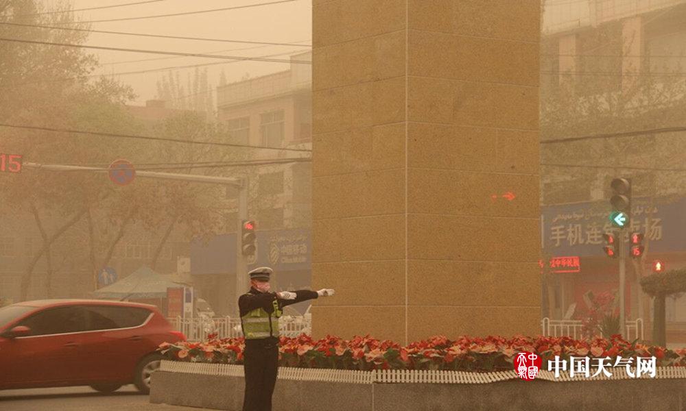 4月3日,新疆和田发布了沙尘暴橙色预警,城市昏黄一片。预计本次天气将持续到5日, 6日开始浮尘逐渐减弱。图为和田市交警在指挥交通。