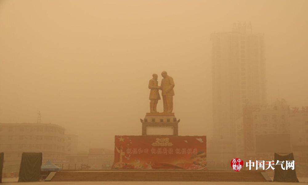 4月3日,新疆和田发布了沙尘暴橙色预警,城市昏黄一片。预计本次天气将持续到5日, 6日开始浮尘逐渐减弱。图为和田市团结广场一角。