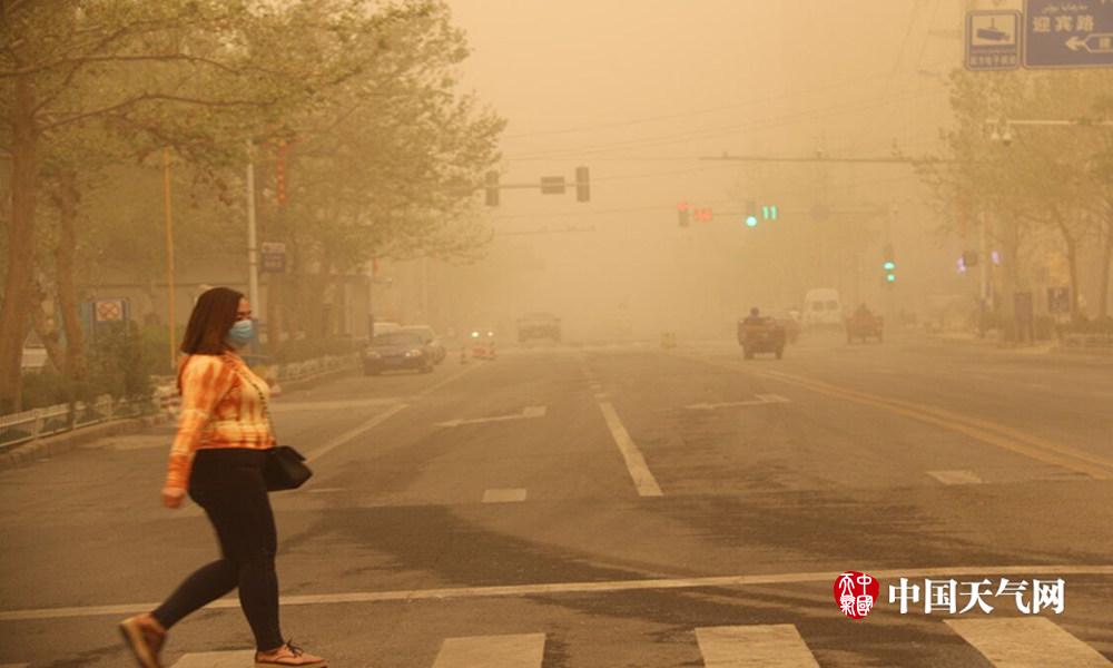 4月3日,新疆和田发布了沙尘暴橙色预警,城市昏黄一片。预计本次天气将持续到5日, 6日开始浮尘逐渐减弱。图为走在大街上的行人。