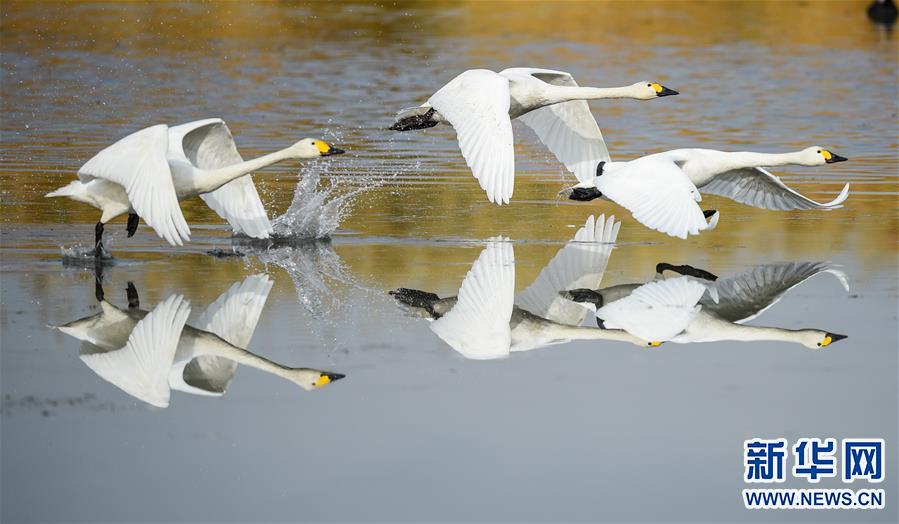 10月28日,天鹅在乌梁素海水面上飞翔。眼下,大批向南迁徙的天鹅在位于内蒙古巴彦淖尔市的乌梁素海停留觅食,为秋日的乌梁素海增添了一份灵动。 新华社记者 连振 摄
