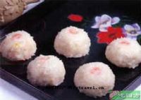 上海冬菜粢毛团是以冬菜粒、鲜肉粒为馅料,相粉团作皮,滚上糯米蒸制而成。