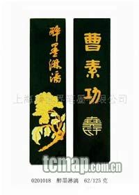 曹氏墨配方严格,用料讲究,工艺精良,优质书画墨的主要原料是桐油。桐油素称“油中之王”,附着力极强。另外加上麻油、猪油、广胶、天然麝香、梅片、冰片、珍珠、金箔以及其它名贵中药香料,运用传统工艺,共经炼、搅坯、翻凉、描金等十二道工序,历时一年之久,精制而成。素功墨具有以下特点:首先,色泽如漆,黝黑之中泛出微微紫光。据《歙县志》和《徽州府志》记载:清康熙皇帝巡视江宁,曹素功进献宝墨。康熙试用后深为赏识,恩赐曹氏“紫 ”。