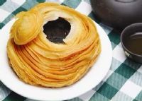 油酥面团卷成多层次的圆柱形,横断数截,垂直拍扁,擀成饼坯。两片饼坯之间夹以火腿、笋丁、鸡丁、虾仁等所制馅心,捏实边沿,油炸成熟。其层次丰富,花纹清晰,色泽金黄,酥脆味香。