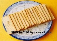 泰州生产麻糕历史悠久,尤其是“嵌桃麻糕”,素享盛誉。双色麻饼始创于清同治年间,兼甜、咸两味,色泽金黄,质地酥脆。嵌桃麻糕原料配方:炒熟糯米粉23千克芝麻粉20千克绵白糖54千克核桃仁5千克。工艺流程: 配料→湿糖拌粉→嵌桃炖制→切片烘制→冷却包装。制作方法: 1.湿糖拌粉:制作前先将糖用水润湿、拌透,然后将湿糖、芝麻粉、糯米粉拌均擦透。再用筛子将糕粉全部过筛。 2.嵌桃炖制:先把糕粉的1/2放入糕模内,压平糕粉,把核桃仁排在糕粉上,每模四排,桃仁嵌好后再加入另一半糕粉,复压实,按平糕面。将糕模放入锅上水蒸或汽蒸,约7分钟。炖制时汽量一定要掌握得当。炖制后参照雪片糕方法回汽。将回汽后的糕体切成4条放入木箱静置,隔日后切片。 3.切片烘烤:把长方形糕条切成糕片,厚度为1.5毫米,每条糕切100片。糕片厚度可视具体重量而定,大则厚,小则薄。切片后把糕片整齐摊平在烤盘内,炉温为130~140℃,烤5分钟后出炉。 4.冷却包装:烤制后的水分只有2%左右,极易吸湿,因此,糕冷却后,要及时包装封口。