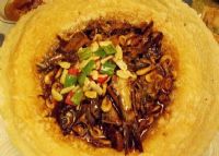 近来年,“活鱼锅贴”又有新的发展。其做法已很少“一锅熟”了。普遍是将“锅贴”、“活鱼”分锅做。“锅贴”也不是贴在锅上,而是在锅边摊成“簿饼”。讲究的再在面里放上芝麻、罗卜丝,或改用玉米面、高梁面等做成不同品味的“锅贴”。有的吃前将“鱼汤”涂在“锅贴”上,也有的吃时用“锅贴蘸鱼汤”,这样食之既有原“韵”,又添新味。夹着香脆的“锅贴”,蘸上鲜浓的“鱼汤”,你就会感到有说不完道不尽的生活韵味。即使宴席已尽尾声,你的情趣会依然如初,即便你离家千里之遥,也会令你留连忘返。不过,你如果有闲情逸致,还是请您到洪泽湖中的鱼船上,或者洪泽湖岸边的渔民家,尝一尝真正“小鱼锅塌”的味道,那才是地道正宗“小鱼锅贴”呢!
