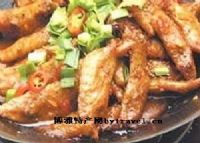 拆骨掌翅为江苏淮阴名菜,以鸡爪(跖)、鸡翅熟制后去骨再浇上鲜香卤汁而成。其特点是:选料讲究、制作精细、形态完整无骨,掌脆、翅肥,清爽鲜香,为下酒佳肴。