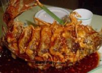 糖醋活鲤鱼:原料:活鲤鱼一尾(重约1000克)、大虾仁、15克、青豆15克、梨片35克、精盐7.5克、蒜25克、番茄酱30克、白醋15克、淀粉25克、白糖50克、绍酒25克、花生油750克(实耗油100克)。(色香味: