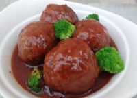 4.起,放入罐内,加鲜汤、盐、料酒、姜(拍松)、葱(挽结),烧沸撇去浮沫,改用小火煨火巴,加入胡椒粉,下苕菜烧入味,放入味精,捞起肉团放盘中,苕菜镶四周,原汁用水豆粉勾薄芡;淋入熟鸡油,浇于盘中即成。