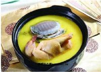 5.再烧热油锅,下花椒炸,随即捞出,将煮鳖裙和鸡的汤滗入锅内,加入料酒煮滚,用生粉水勾芡,浇在鳖裙鸡肉碟内即可。