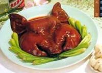 出锅装盘时按顺序摆好舌头、头肉、腮肉、猪耳、眼球,整成猪头形,浇上原汁,缀上菜心即成。