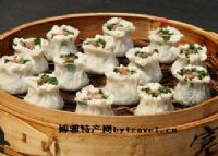 4、左手托起面皮,挑馅心35克抹在面皮中问,随即五指合拢包住馅心,五指顶在烧卖坯的1/4处捏住,让馅心微露,再将烧卖在手心转动一下位置,以大拇指与食指捏住"颈口",并在烧卖坯口上点缀少许火腿未,放入有马尾松针的蒸笼内,盖上盖,上锅蒸约5分钟即成。面皮不粘手时即熟。