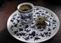 其实,熏豆茶中只有少量嫩绿的茶叶,更多的是称之为“茶里果”的佐料,其种类繁多,一般有以下几种:第一种叫熏豆,又名熏青豆。采摘嫩绿的优良品种的黄豆,本地人叫“毛豆”,经剥、煮、淘、烘等多种工序加工而成,后再放人干燥器中贮藏备用。它具有馨香扑鼻、咸淡相宜、和胃益中等特点;第二种是芝麻,一般选用颗粒饱满的白芝麻炒至芳香即可;第三种,民间叫“卜子”,其学名为“紫苏”。熏豆茶中所用的紫苏以野生为上。只可惜目前野生者渐少,多以人工培育者代之。紫苏经炒制以后,不但芳香浓烈,还具有理气开窍、消食和胃的药理作用;第四种为橙皮,是一种产于太湖流域的酸橙之皮。也可用蜜饯中的“九制陈皮”代之,但更多的却由民间自制。他们用桔子皮经煮、刮、切、腌、晒等多道工序加工而成,具有理气健胃之功效;第五种,名为丁香萝卜干,即胡萝卜干。胡萝卜洗净切丝后有两种制法:一以适量的盐生腌后晒干即成;另一种煮熟后腌制,晾干。后者更适宜牙齿不便的老年人食用。