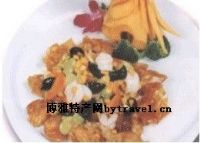制作:将炒锅烧热,加油烧至六成热时,加入馄饨炸脆捞出,沥净油,装盘。将虾仁滑油至熟捞出,将玉米粒,青豆,木耳入沸水锅中焯熟捞出,然后将所有配料入锅煸炒,加入清汤,精盐,味精,沸后勾芡,淋明油,出唤浇在馄饨上即可。