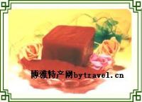 取山楂果汁,配以白糖、琼脂,冻结成板,切成棱形或扁方块出售。其味甘冽微酸,具有消积、化滞、行瘀的食疗价值