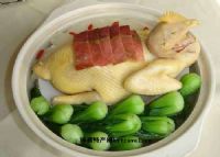 4. 然后,把火腿片、笋片、香菇排列于鸡身上,加入精盐、黄酒、味精,加盖上蒸笼用旺火蒸约30 分钟,取出。