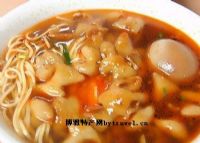 3、另取一深锅,倒入大骨高汤煮至滚沸时,加入作法1的红面线、蒜酥及材料A的竹笋丝、猪油一同焖煮15分钟后,以太白粉水勾芡成浓稠状,食用前加入乌醋、蒜泥、九层塔即可。