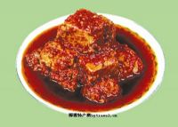 工艺:先将豆腐切成小方块,压去一些水分,置于室内竹笼中,撒上经过人工培植提纯的毛霉菌种,加盖保温,让其发酵。当豆腐块发霉,腐面上的白绒毛长至二、三厘米厚时,装入坛中,配 以辅料,倒入配制好的盐水(每一百毫升水加食盐二十克)浸渍,盐水以淹没最上层豆腐块 一、 二厘米为适度。再用湿泥密封坛口,让其融去菌毛,继续发酵,促使大豆蛋白进一步分 解为氨基酸,使辅料的鲜香味汁渗透进腐乳坯块中。数月之后,即成熟为腐乳。发酵期越长,质量越好,味道越美。装坛时,加入不同辅料,又制成了多种风味的腐乳。