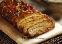 豆腐衣卷上面盖一块木板,再用石头压住,2小时后取出。再切成0.9厘米宽的片,整齐地装入盘内,浇上酱油、香油即成。