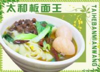 太和板面的由来,没有想去考证过。太和是小城,地处安徽的西北角,名不见经传。但是本地人颇多跑江湖者,东西南北国内国外跑一圈之后,往往感叹——住在大连多伦多,消费在上海香港,吃——还得在太和!靠山吃山靠水吃水,这里没山没水,有何可吃?就有太和人笑你,那你是没吃过!板面,羊肉板面! 太和板面一是面好,二是汤料好。太和县出产优质小麦,板面条取小麦精粉,根据一年四季的不同,按比例用食盐、水加以搅拌,和成面团,反复揉搓之后,制成直径半寸,长八寸的小面棒,再涂上香油,码在案子上,蒙上干净的湿毛巾。滋润好的面棒柔软缠绵,触摸如丝绸。 做板面时,厨师在案子上排好三根小面棒,左手捏三个头,右手捏三个头,猛地举过头顶,狠狠地摔在案子上。接二连三,噼里啪啦,边摔,边拉,边闪,板面由此而得名。三根小面棒在厨师手里由短变长,由粗变细,折合三次,总长度达五丈有余,而且粗细均匀,提起似一道瀑布。 捞起煮好的板面,清白润滑,晶莹透亮。厨师捏上一些嫩绿的青菜放在上面,然后浇上沸好的枣红色的汤料。白的面条,绿的菜叶,红的汤料,使人食欲大增。 臊子的制作也十分讲究。用料有茴香、花椒、桂皮、面酱、食盐、红辣椒、羊油和羊肉等。制一锅臊子,各种用料按一定比例和顺序投放。制作时,先将羊油稀释烧沸,然后再下佐料。晒干的红辣椒用量较大,以突出臊子的辣味和色泽,羊肉也占较大的比例。把上等精羊肉切成方楞四正的小块块,待辣椒红颜色下来之后,再把羊肉丢进锅里。这时,必须掌握好火候,才能把羊肉烧得不老不嫩,恰到好处。 臊子做好后,舀到搪瓷盆里,凉后便凝结成固体,随吃随取,常年存放,不会变质 漫步太和,板面馆见缝插针般地散布在全城的每个角落,随处可见,食客还没进门就冲老板喊:”一大碗!!!多加点辣的”老板便会爽快的说:好嘞,里面坐!!!有时候还让老板加个鸡蛋,那鸡蛋是在板面汤里泡了很久的,蛋黄里面都有臊子的汁液了.在面还没上来之前筷子已经在手里了,听着老板在案板上啪啪的摔板面的声音再加上鼻子闻到板面汁飘来的香,已经是口齿生津了.吃板面是没什么讲究的,白白的宽宽的面(很劲道的)有绿的菠菜叶盖着,红的羊肉臊子汁液浇在上面,盛板面用的是姜黄色的搪瓷大号碗,就这大碗也透着太和人的豪爽!一大碗端上来,迅速的用筷子在面里搅拌几下,有人有耐心的会慢慢的搅,让胃再吊吊,吃的时候可都是虎狼模样了,有人中途用双手捧起来大碗喝板面汤,有人习惯先吃完碗里的面,菜叶也拣吃干净喽,再捧起碗将汤一饮而尽,餐巾纸是必不可少的,哪怕是最寒冷的冬天里,满头大汗不及时擦喽汗珠儿会坠入碗中的. 三五知己小酌,板面馆是绝好的去处。简单几个小菜,悠悠一壶老酒,随性几声笑谈,但可引出一片欢腾。家长里短的琐屑,亲朋邻里的纠葛,在热情火辣的板面汤里,化作淡然笑声。趁着那热乎乎的劲头,发几句牢骚,讲几句心愿,也许,不曾相识的陌生人,从板面馆出来后,就成了无话不说的朋友。太和人的豪爽与好客体现的淋漓尽致。 太和板面一吃上瘾,食者无不感叹:“太和板面,面中之王,食太和板面,天下无面”。矣,这话听着咋象广告呢!......哈哈!