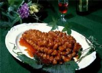 制作方法:鱼肉洗净,修成梯形,放调料腌20分钟,粘一层面包屑,下7成热油中炸至金黄色,呈葡萄糕状时捞出装盘。菜叶焯水修成葡萄叶状,贴在鱼肉旁,用白糖、白醋、盐和现榨的新鲜葡萄汁淋上,即成了一道色泽晶莹,形状味道都极富葡萄风味的一道特色菜。