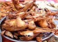 制作方法:麻雀剥皮毛,去脏,留肝、心,洗净,进锅文火焙干水,放盆内下甜酒拌匀,焖30分钟,锅下油1斤烧热,雀进锅炸至头见白色捞出。卤锅下酱油、盐、糖、姜、葱、八角粉、少量水烧沸后,先下味精,再将麻雀倒进锅轻轻拌匀(重易碎),贮入小罐浇麻油2两,冷却扎口焖一天后,装盘浇卤法即可食用。