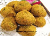 (1)芋艿蒸酥绞成泥,面包去皮切成0.5厘米见方小丁。在芋艿中投入盐、葱未、味精、生粉,拌匀后做成40克1只的坯,包入黄油,滚上面包丁。