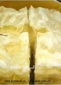 千页糕”为选用中筋面粉制成的甜点。多层美观,油香软润,入口溶化。将面粉加入酵母、白糖、清水和成面团,饧面约2个小时,加碱水再揉匀。肥膘肉切块放入汤锅,用旺火煮熟捞起,然后切成细肥肉丁。将面碾成薄面片,对折,一边撒上1层肥肉丁,再撒上1层白糖,形成1层面馅,如法制作可得4层面3层馅。