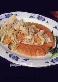 原料:净海蚌肉400克、熟冬笋75克、水发香菇10克、西红柿2个