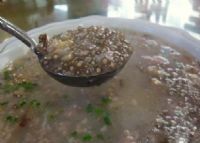 关于珍珠汤,龙南民间还有一个传说。传说在清道光年间,龙南的龙头鱼丰收,一位名叫徐思庄的人大量进贡龙头鱼,皇上便派钦差大臣前往龙南给他赏赐。夏日炎炎,山路岖崎难行,钦差大臣途中中暑。来到徐思庄家已近黄昏,圩镇上大鱼大肉已卖完,徐思庄便炖煮龙南客家名菜“珍珠汤”给钦差食用,钦差取匙食之,顿时劳累尽消,甚觉是稀世珍肴。问其菜名,徐思庄看到珍珠米颗颗晶莹剔透,如龙眼一样,为取悦钦差,便说是“龙眼汤”,并阐述:“此汤是取百丈龙潭的龙头鱼之目烹调而成,故名龙眼汤,用以孝敬大人。”钦差听后,觉得此菜名犯上,徐思庄惶惶不安,忙解释此非贡品“龙头鱼”之目所煮,而是龙南民间的地方菜肴。随即,徐思庄请钦差赐予菜名。钦差受其奉承和热情款待,难以推却,几经推敲后说:“就叫‘珍珠汤吧。”因此,“珍珠汤”或“珍珠粉”沿用至今