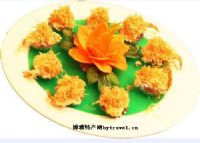 3、把炸好的虾沾上色拉酱,放上土豆丝即可。