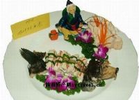 制作工艺:桂鱼初加工,切成大片,王花肉连同香菜打茸,卷入鱼片蒸熟,鸡汁勾芡即成。