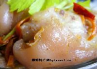 原料: 猪蹄500克,姜片5片,葱白3根,芹菜50克,红萝卜丝30克,干红辣椒10克,剁辣椒10克。