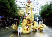 湖口草龙的编扎工艺,要求选料精致优良,制作精细巧妙,采用编、插、织、嵌、镶、绕、缠、悬、挂、空、别、剔、镂、透等多种手工技巧,分别编织龙头、龙须、龙舌、龙牙、龙身、龙鳞、龙节、龙尾等部分,组成形态为狮头、鹿角、鹰爪、蛇身、鱼尾的整条草龙。